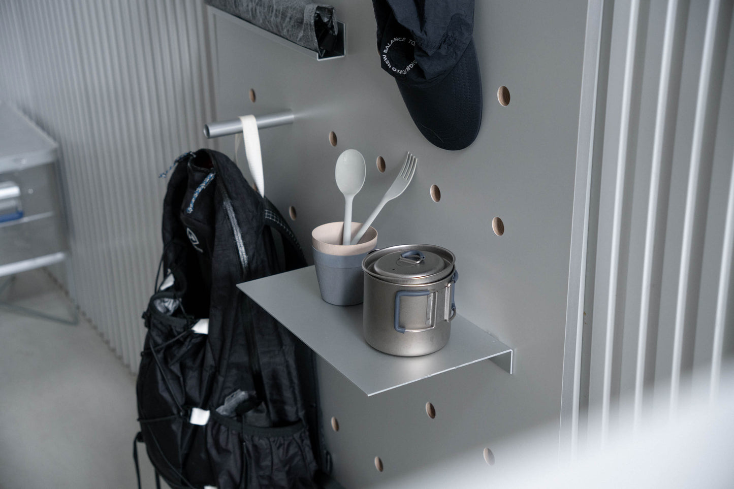 小物は ジャンルごとにまとめ、迷いをなくす配置に。右上は Hook Rack で身につける小物を、左上はクッカーやカップなど食のギアを集約しました。